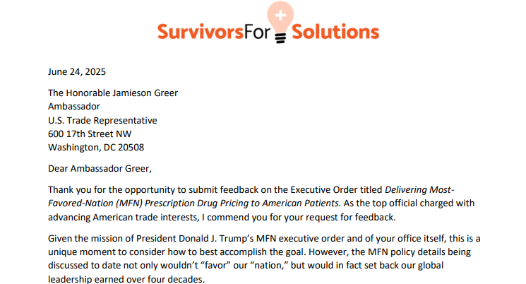 News THG Digital 10/2/25 THG Digital 10/2/25 SFS’s Statement on the Trump Administration’s Latest MFN Announcement Read More THG Digital 9/22/25 THG Digital 9/22/25 CZ Speaks on Impact of Government Price Controls Read More THG Digital 9/17/25 THG Digital 9/17/25 SFS Releases New Survey: Americans Reject Foreign-Style Drug Pricing Schemes Read More THG Digital 9/17/25 THG Digital 9/17/25 Most Favored Nation & QALY Survey Memo Read More THG Digital 7/31/25 THG Digital 7/31/25 SFS Statement on Senate HELP Committee Hearing: “Making Health Care Affordable: Solutions to Lower Costs and Empower Patients” Read More THG Digital 6/26/25 THG Digital 6/26/25 SFS’s IPAY 2028 Comment Read More THG Digital 6/24/25 THG Digital 6/24/25 SFS Submits Comments to USTR on the Harms of MFN Read More THG Digital 6/17/25 THG Digital 6/17/25 Op-ed: Most Favored Nation Has No Place in U.S. Healthcare Read More THG Digital 6/4/25 THG Digital 6/4/25 SFS Urges Senators to Oppose Inclusion of MFN in Reconciliation Read More THG Digital 5/22/25 THG Digital 5/22/25 SFS Statement on the Reintroduction of the SMART Prices Act Read More Older Posts