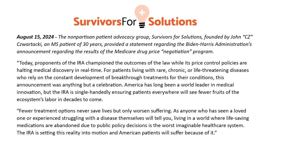 News THG Digital 11/6/24 THG Digital 11/6/24 SFS Statement on the Election of Donald Trump to be the 47th President of the United States Read More THG Digital 9/24/24 THG Digital 9/24/24 Survivors for Solutions Celebrates the 40th Anniversary of the Hatch-Waxman Act Read More THG Digital 9/11/24 THG Digital 9/11/24 SFS Statement on the Trump-Harris Presidential Debate Read More THG Digital 9/9/24 THG Digital 9/9/24 Op-Ed: The IRA Unleashes an Assault on Patients’ Cures and Fails America Read More THG Digital 8/16/24 THG Digital 8/16/24 Press Release: The IRA Gets A Failing Grade Read More THG Digital 8/16/24 THG Digital 8/16/24 Report Card: Inflation Reduction Act Read More THG Digital 8/15/24 THG Digital 8/15/24 SFS Statement on the Medicare Drug Price Announcement Read More THG Digital 7/26/24 THG Digital 7/26/24 SFS Written Statement: Ways & Means Innovation Hearing Read More THG Digital 7/15/24 THG Digital 7/15/24 Press Release: Survivors for Solutions Releases 2024 Choices Roadmap Read More THG Digital 6/19/24 THG Digital 6/19/24 Comments on the Medicare Drug Price Negotiation Program for IPAY 2027 Read More Newer Posts Older Posts